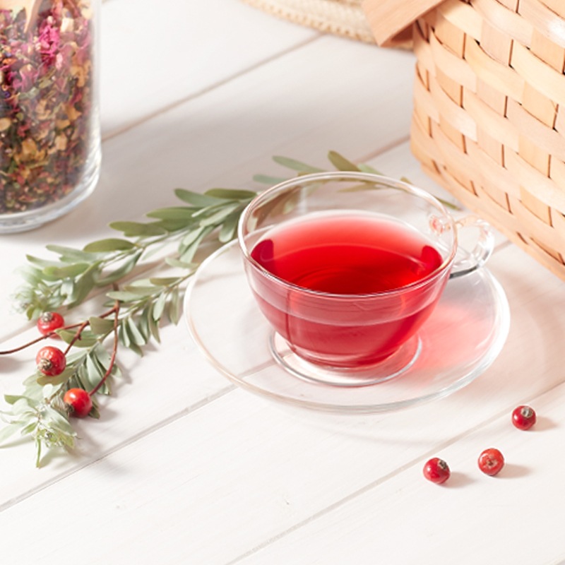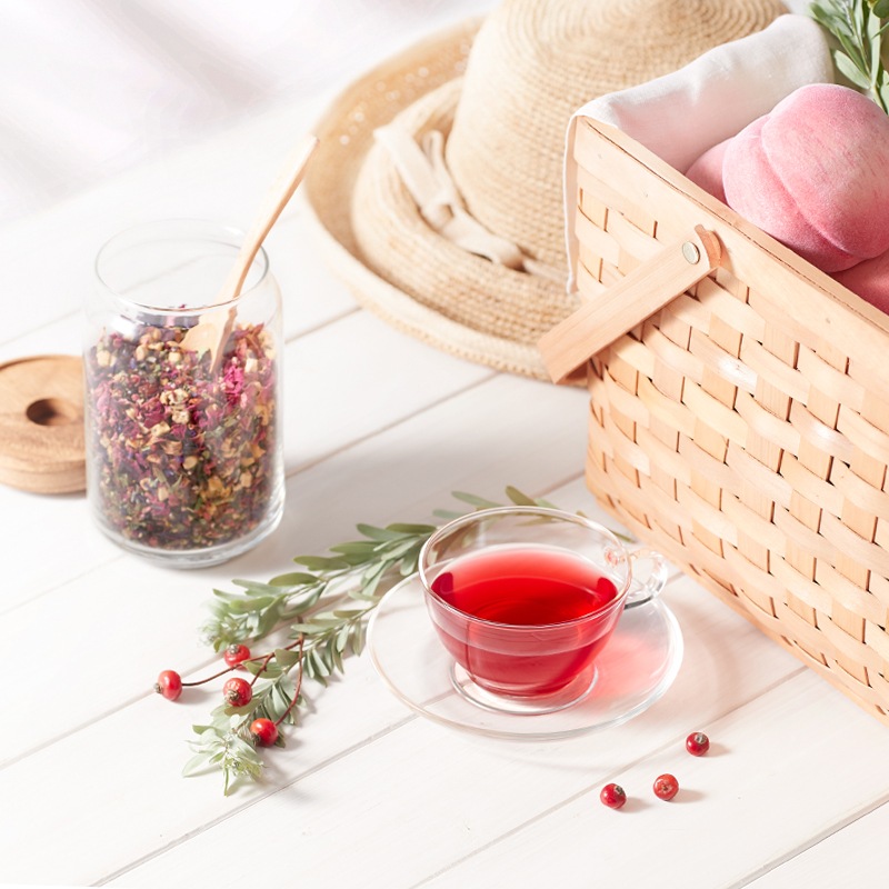 ピーチフレーバー(乾燥リンゴ、ピーチ果汁)、ローズヒップ、ハイビスカス、